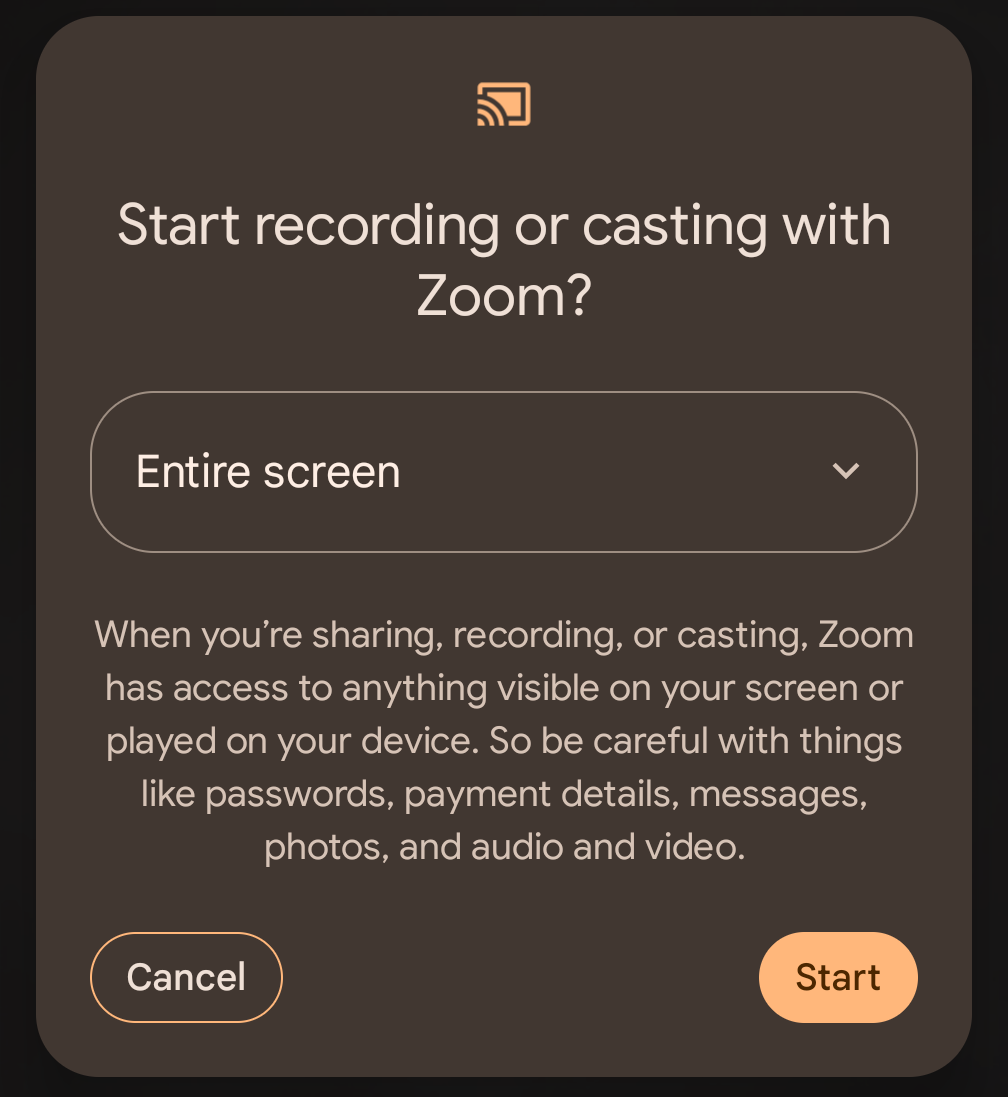 3a. If you select Screen, you'll see a prompt asking for permission to begin streaming your phone screen. Click "Start" to allow it.