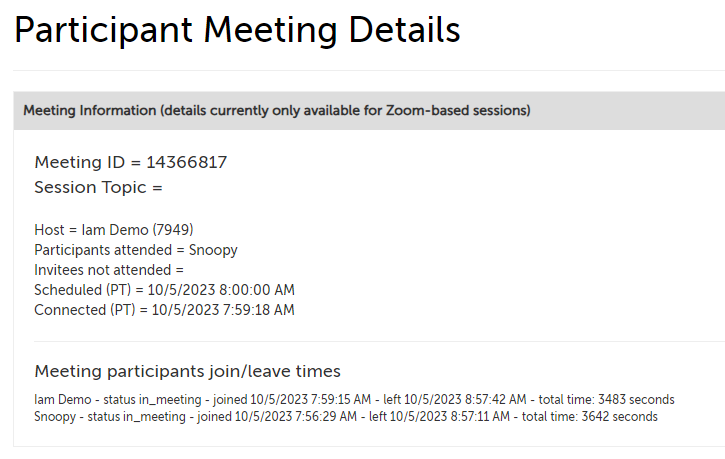 - Scheduled: the date/time the session was scheduled for. This will display in the logged-in user's time zone.