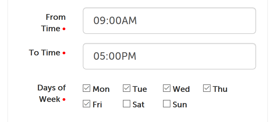4. Click on the "From Time" field to have the timepick appear. Click a starting hour and then select minute value, in your account's time zone. Click "AM" or "PM" to indicate which is applicable.