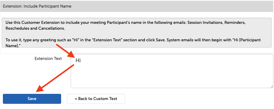 To use it, type any greeting such as “Hi” in the “Extension Text” section and click Save. System emails will now begin with “Hi [Participant Name],”