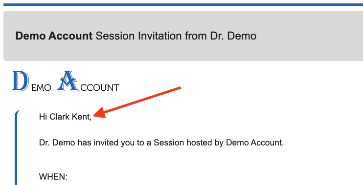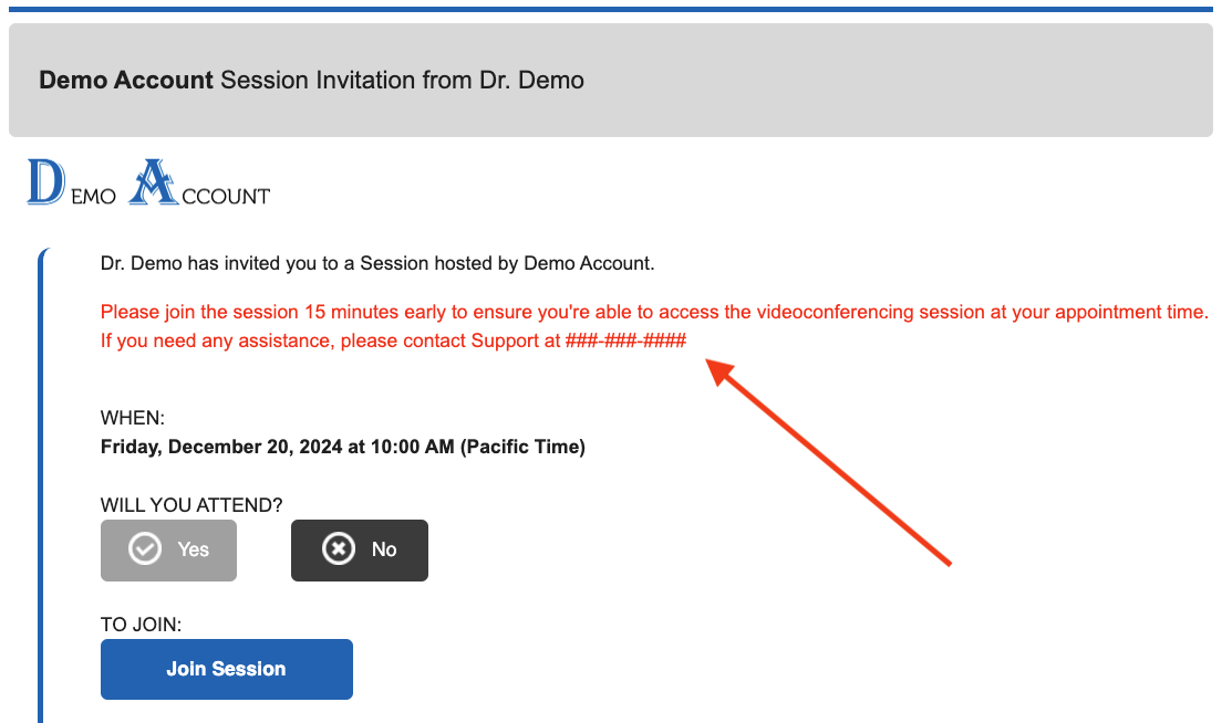 Additional text will be added in bold directly beneath the Join Session button on invitations, reschedules, and reminder emails.